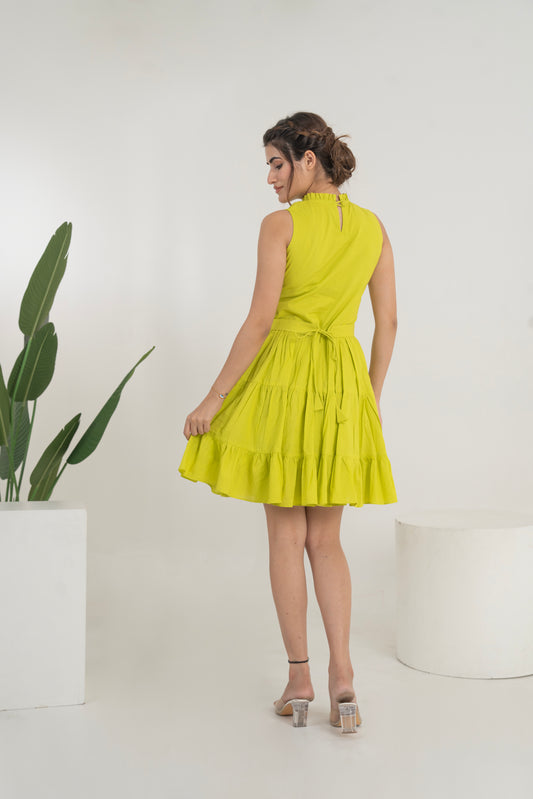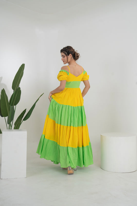 Mohey Solid Yellow Green Cotton Long Tier Dress